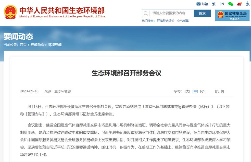 9月15日,生态环境部审议并原则通过《温室气体自愿减排交易管理办法(试行)》(下简称为《办法》),CCER(中国核证减排量)正式重启。此次试行的《办法》正式取代了2012年起印发执行的《温室气体自愿减排交易管理暂行办法》。