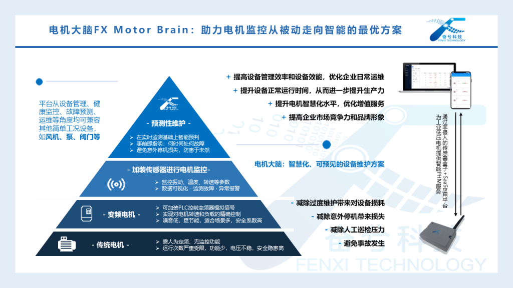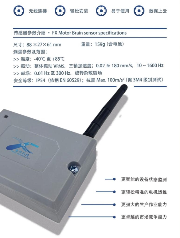 作为对电机进行智慧化赋能的端到端一体化系统,通过将传感器硬件加装在电机表面,采集数据上传云端,利用工业机理+AI算法,电机大脑实现了对电机的可视化管理、智能化监测和预测性维护。