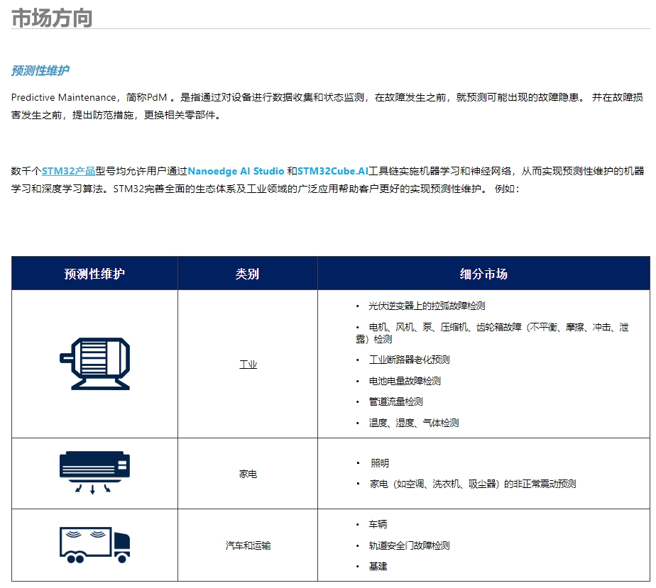 再说到重点关注方向上,今年意法半导体在STM32峰会上也介绍了利用STM32的AI技术实现电机驱动优化的示例,边缘人工智能在整个行业发展中将会成为一个非常重要的方向。如何更大化地展现电机驱动或其他半导体技术的价值,核心便在于应用。ST微控制器和数字IC产品部总裁 Remi El-Ouazzane在会上发言表示,“人工智能永远不是只关注硬件产品,人工智能更加关注的是软件端,软件端是关键。” 而看到ST官网,STM32 人工智能生态也极力主张了预测性维护(PdM)作为市场方向的重大意义。