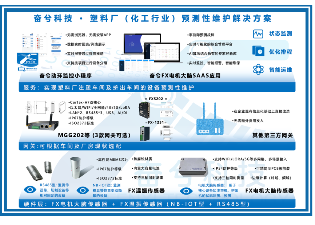设备的监测和维护是企业的刚需,不仅是技术问题也是经济学问题。尽管许多厂家已经采用了状态监测系统,但通常仍依赖一般传感器实时监控或人力定时巡检,缺乏深度学习和高级算法支持,导致处于被动维护模式。为了应对不确定性,我们为某塑料厂的挤出车间和注塑车间进行设备状态监测。根据设备的重要性和成本考量,常用设备需实时状态监测和报警,核心设备则需要进行预测性维护。