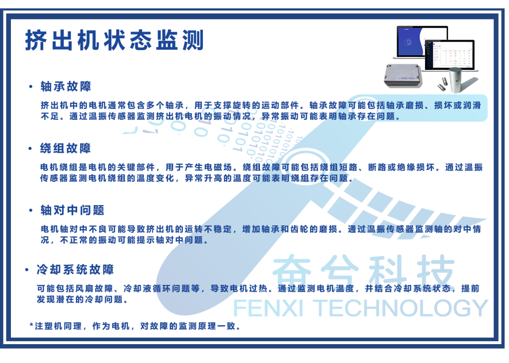 在注塑机和挤出机外部加装电机大脑传感器,成功部署预测维护算法,主要实现了对轴承故障、绕组故障、轴对中问题、冷却系统故障的关注。