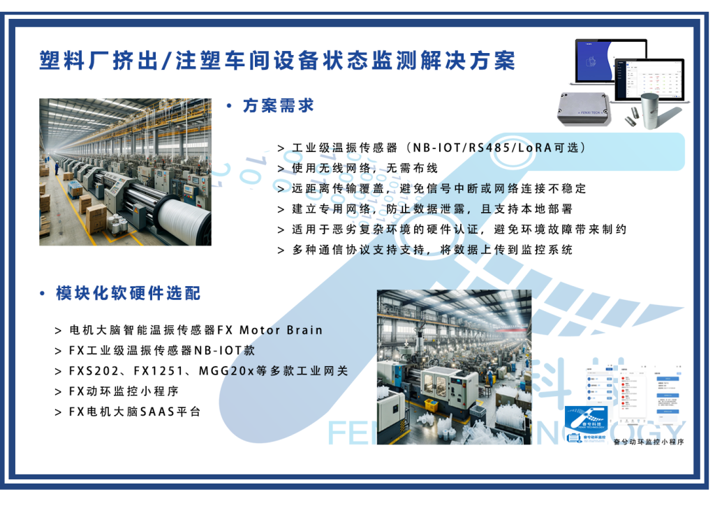 同时,安装NB-IOT温振传感器在模具上,监测模具的温度和振动;在传送带和切割设备关键部位安装RS485温振传感器,进行实时状态监测,确保传送带和切割设备的正常运行。