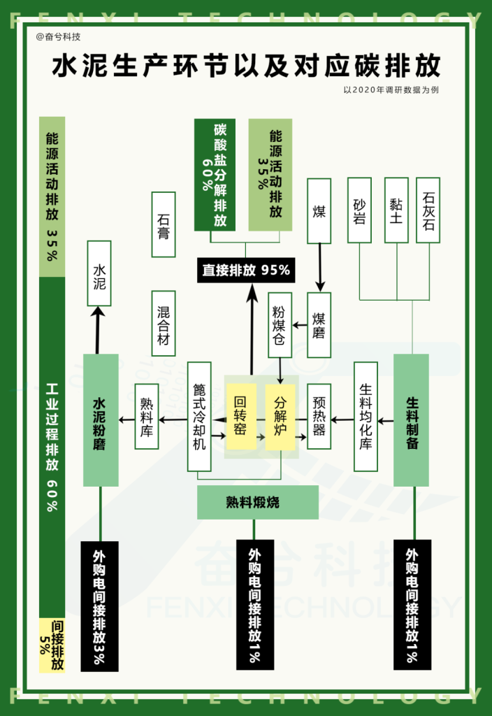 水泥生产分为原料制备、熟料生产和水泥粉磨三个阶段,其中熟料生产占总排放的95%。在熟料煅烧过程中,石灰石和黏土混合后被送入高温回转窑,产生大量二氧化碳,这一过程贡献了60%的碳排放。同时,能源燃烧排放占总排放的35%,其余5%是由外购电力间接排放。