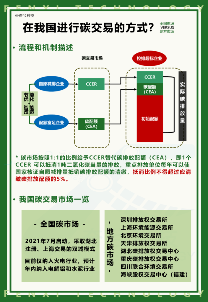 在前文对CCER和CEA进行介绍后,我们简单描述了“碳市场”,然而碳是如何被市场化的呢?自2011年开始,我国陆续建设了9个地方性碳交易市场,并于2021年启动全国碳市场,下图对碳市场的交易进行简单介绍。